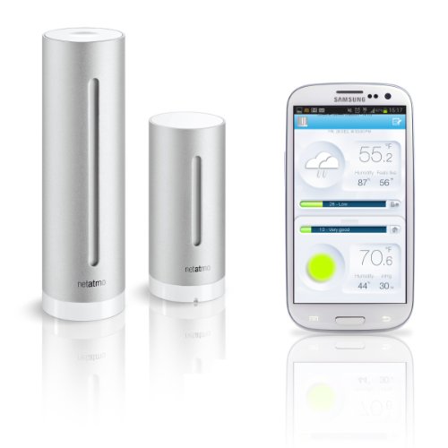 The Netatmo Urban Weather Station.The First Personal Weather Station for iPhone and Android with Air Quality measurements, to monitor and track your environment.Discover what the Netatmo Weather Station can do for you.The Netatmo Weather Station contains a unique set of sensors to monitor your living environment (temperature, barometric pressure, humidity, CO2 concentration, noise pollution... ). The Netatmo Station wirelessly transmits all your data to your iPhone. The Netatmo App displays your Station's indoor and outdoor measurements into clear and comprehensive dashboards, graphs and notifications.All of your data is recorded online and made permanently accessible for you, on your iPhone.Seamlessly measure, track and monitor your Weather and Environment, indoor and outdoor, at any time and from anywhere.Improve your Wellness, adapt your activities ! We spend 80% of our time indoor, resting, playing with the kids or at the office.The Netatmo Station monitors your indoor air quality (CO2 concentration), and reminds you to ventilate, at the right moment.The Netatmo Urban Weather Station allows city dwellers to monitor indoor air quality, get real-time updates on local Air Quality Index report and pick the best moments for outdoor activities.The Netatmo Weather Station also monitors noise pollution and measures home or office acoustic comfort.Pack content: Netatmo weather station (indoor module + outdoor module) - USB cable - USB wall adapter - Wall-mount kit for outdoor module - 4 AAA batteries - Free App, available on the App Store